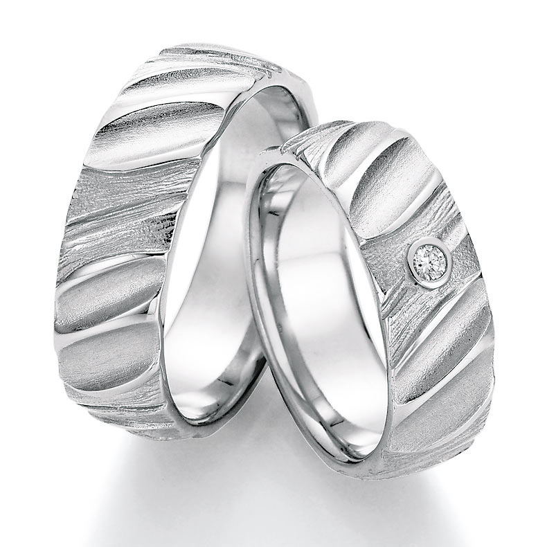 Kollektion Fascination of art der Firma Nowotny aus Österreich. Gelungene Trauringe mit schönen zisilierten Fugen in 585 Gelbgold für den schönsten Moment im Leben. 1 Brillant 0,04 ct. W/SI. Breite 6,8 mm.