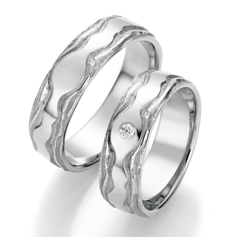 Kollektion Fascination of art der Firma Nowotny aus Österreich. Gelungene Trauringe mit schönen zisilierten Fugen in 585 Gelbgold gehämmert poliert für den schönsten Moment im Leben. 1 Brillant 0,045 ct. W/SI. Breite 6,1 mm.