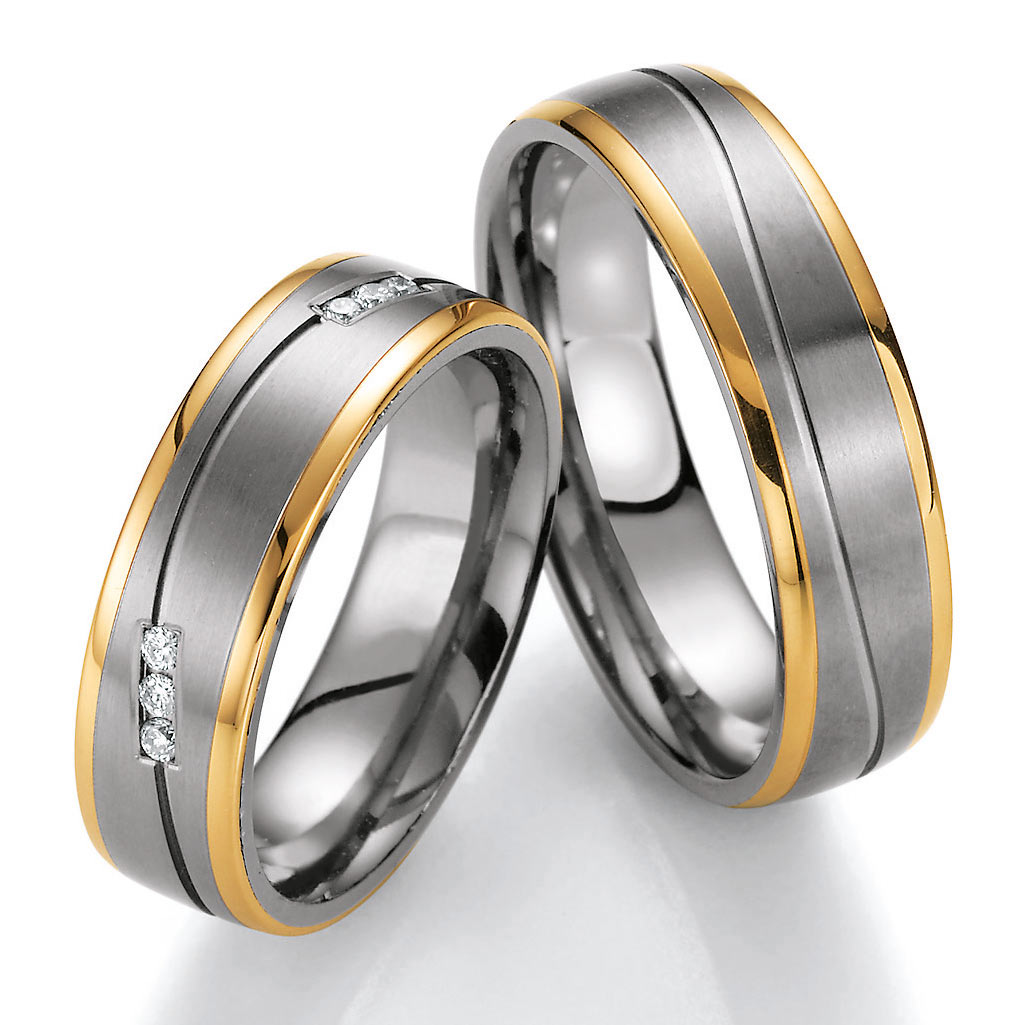 Faszinierende Trauringe aus Weissgold und Titan der Manufaktur Nowotny - Österreich. Kollektion White-Style. Diese gelungene Trauringe aus Titan seidenmatt in Kombination mit 585 Gelbgold poliert sind in Größen 45-75 zu erhalten. Entscheiden Sie sich für eine schöne, zeitlose und inklusive Gravur. 12 Brillanten zusammen 0,156 ct. W/SI. Breite 6,00 mm.
