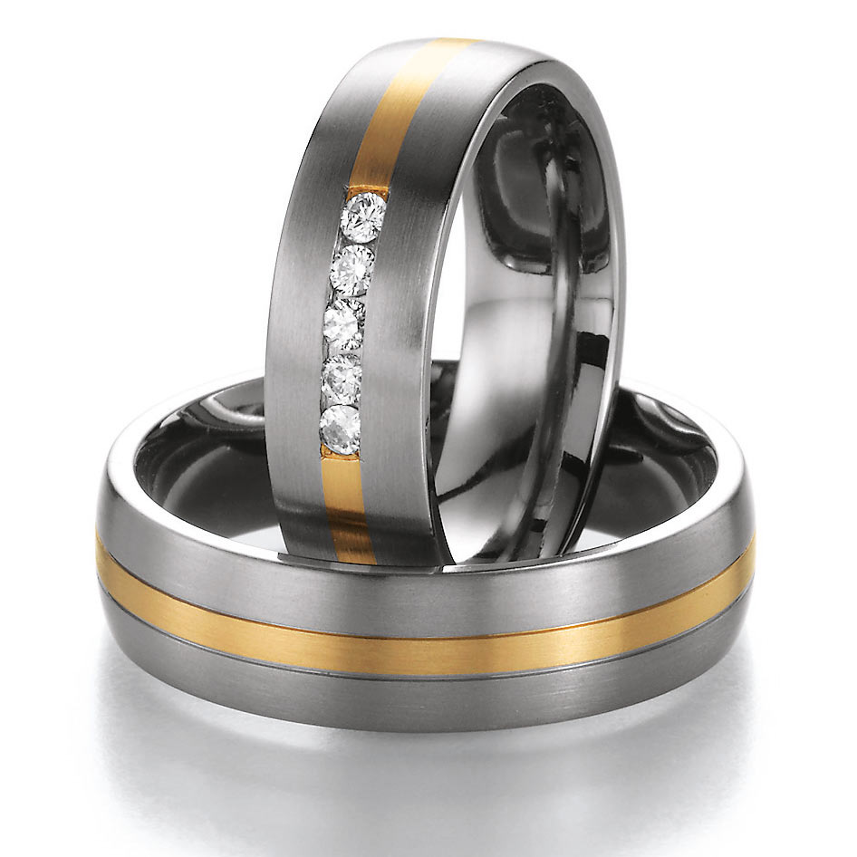 Faszinierende Trauringe aus Weissgold und Titan der Manufaktur Nowotny - Österreich. Kollektion White-Style. Diese gelungene Trauringe aus Titan seidenmatt in Kombination mit 585 Gelbgold seidenmatt sind in Größen 45-75 zu erhalten. Entscheiden Sie sich für eine schöne, zeitlose und inklusive Gravur. 5 Brillanten zusammen 0,15 ct. W/SI. Breite 6,00 mm.
