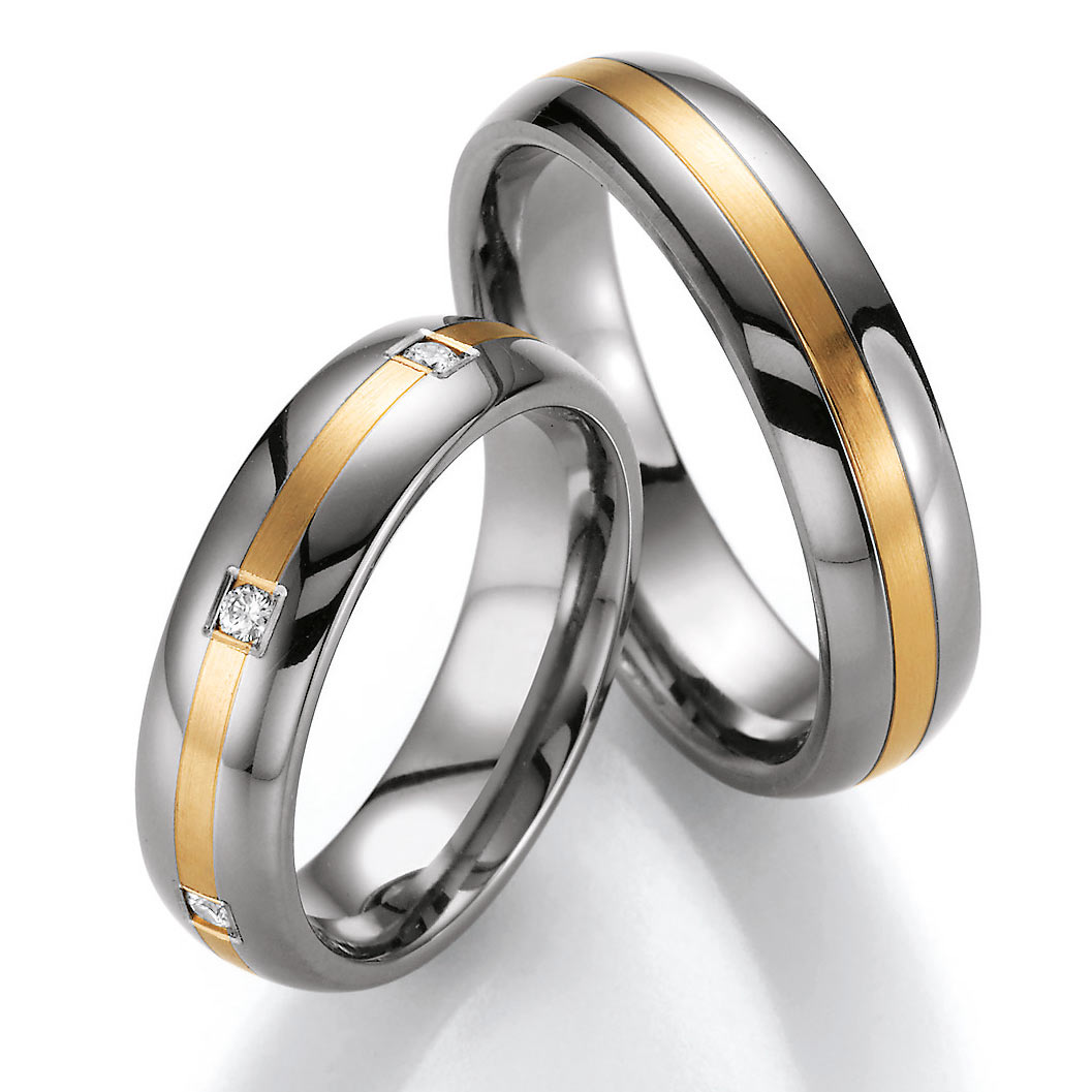 Faszinierende Trauringe aus Weissgold und Titan der Manufaktur Nowotny - Österreich. Kollektion White-Style. Diese gelungene Trauringe aus Titan poliert in Kombination mit 585 Gelbgold seidenmatt sind in Größen 45-75 zu erhalten. Entscheiden Sie sich für eine schöne, zeitlose und inklusive Gravur. 6 Brillanten zusammen 0,15 ct. W/SI. Breite 5,50 mm.