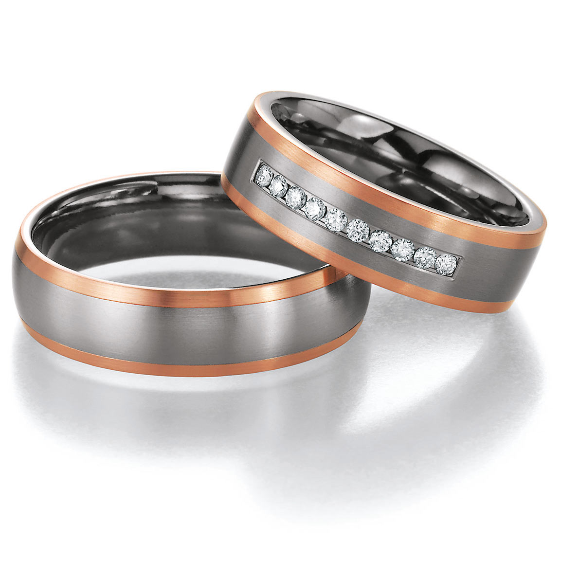 Faszinierende Trauringe aus Rotgold und Titan der Manufaktur Nowotny - Österreich. Kollektion White-Style. Diese gelungene Trauringe aus Titan seidenmatt in Kombination mit 585 Rotgold seidenmatt sind in Größen 45-75 zu erhalten. Entscheiden Sie sich für eine schöne, zeitlose und inklusive Gravur. 10 Brillanten zusammen 0,15 ct. W/SI. Breite 6,00 mm.