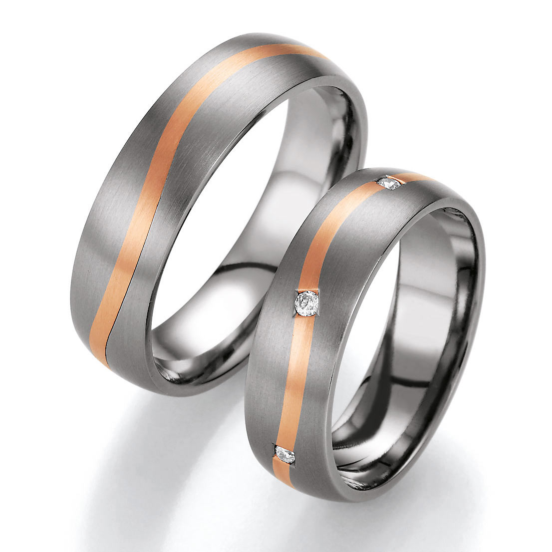 Faszinierende Trauringe aus Rotgold und Titan der Manufaktur Nowotny - Österreich. Kollektion White-Style. Diese gelungene Trauringe aus Titan seidenmatt in Kombination mit 585 Rotgold seidenmatt sind in Größen 45-75 zu erhalten. Entscheiden Sie sich für eine schöne, zeitlose und inklusive Gravur. 6 Brillanten zusammen 0,15 ct. W/SI. Breite 6,00 mm.