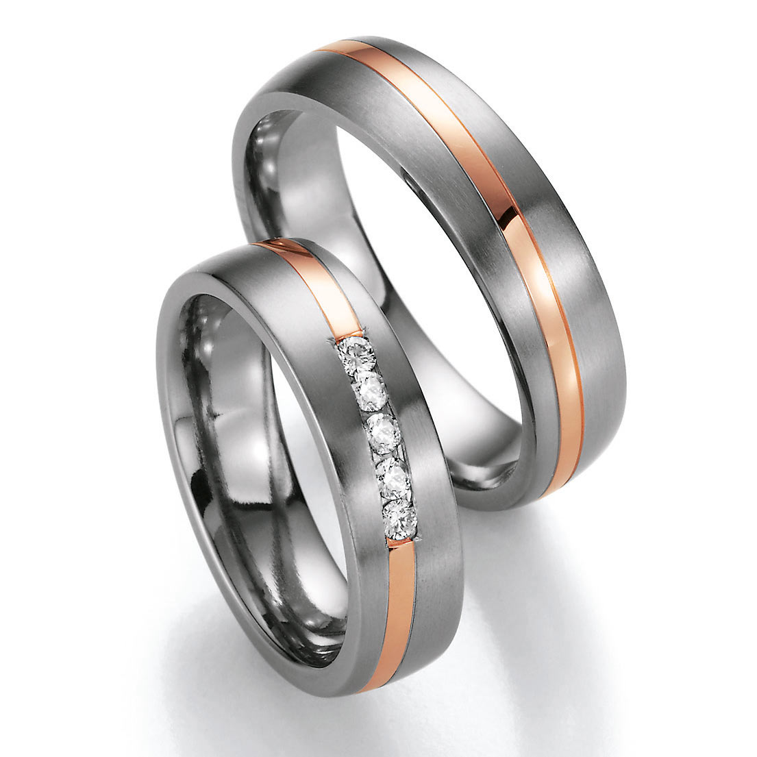 Faszinierende Trauringe aus Rotgold und Titan der Manufaktur Nowotny - Österreich. Kollektion White-Style. Diese gelungene Trauringe aus Titan seidenmatt in Kombination mit 585 Rotgold poliert sind in Größen 45-75 zu erhalten. Entscheiden Sie sich für eine schöne, zeitlose und inklusive Gravur. 5 Brillanten zusammen 0,15 ct. W/SI. Breite 5,50 mm.