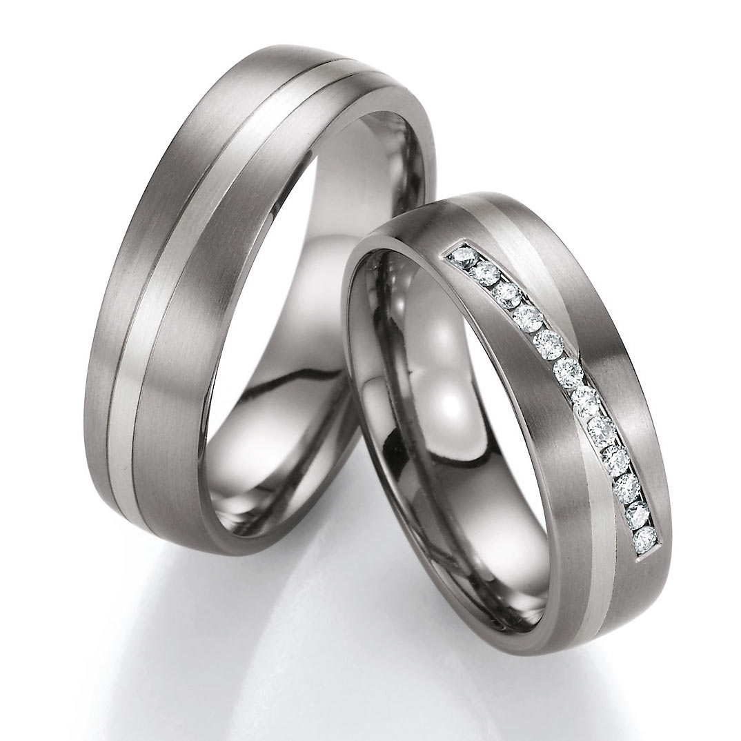 Faszinierende Trauringe aus Weissgold und Titan der Manufaktur Nowotny - Österreich. Kollektion White-Style. Diese gelungene Trauringe aus Titan seidenmatt in Kombination mit 585 Weissgold seidenmatt sind in Größen 45-75 zu erhalten. Entscheiden Sie sich für eine schöne, zeitlose und inklusive Gravur. 12 Brillanten zusammen 0,156 ct. W/SI. Breite 6,00 mm.
