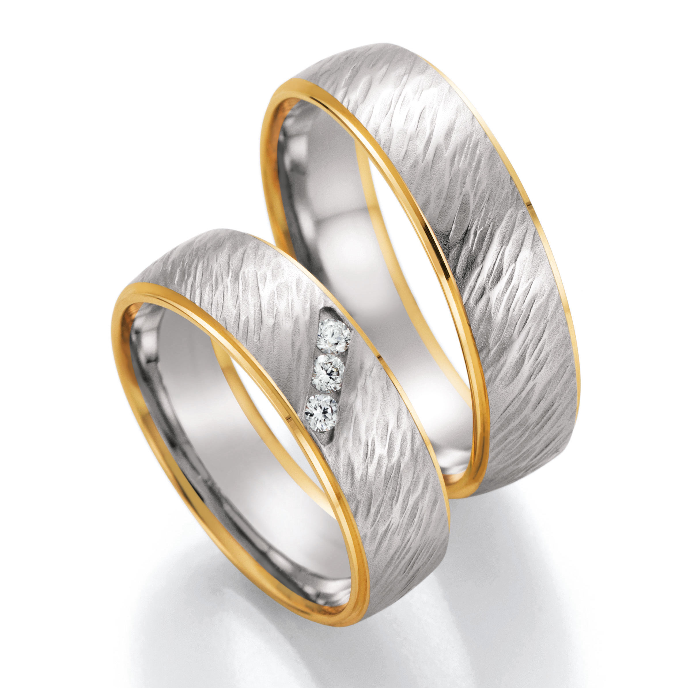 Tadellose Trauringe in 333 Weissgold mit Prägung matt-Gelbgold poliert. 3 Brillanten zusammen 0,09 ct. W/SI. Breite 6,00 mm. Am Standort in Wien werden Eheringe und Trauringe in hochwertigen Legierungen hergestellt. Die Trauringe können Sie mit und ohne Steinbesatz bestellen in jeder Ringgröße.