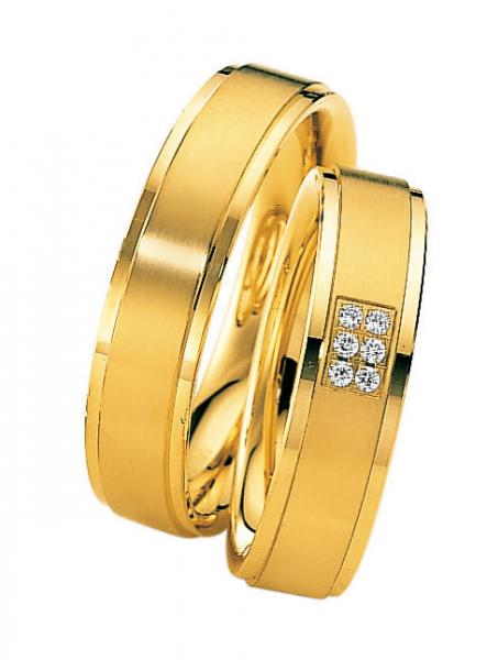 Manufaktur Saint Maurice - Deutschland. Kollektion - Eternity. Die Pforzheimer Manufaktur stellt nicht nur wunderschönen Schmuck sondern auch perfekt aussehende Trauringe. Trauringe in 585 Gelbgold seidenmatt und poliert. 6 Brillanten zusammen 0,06 ct. W/SI. Breite 5,50 mm.
