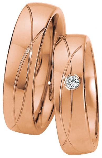 Ringe in Rotgold mit Kupfer legiert. Märchenhafter Goldton aus 1001 Nacht. Wird in den meisten orientalischen Ländern bevorzugt. Manufaktur Saint Maurice - Deutschland. Kollektion Pas de Deux. Die Pforzheimer Manufaktur stellt nicht nur wunderschönen Schmuck sondern auch perfekt aussehende Trauringe. 585 Rotgold poliert mit Fugen. 1 Brillant 0,055 ct. W/SI. Breite 6,00 mm.