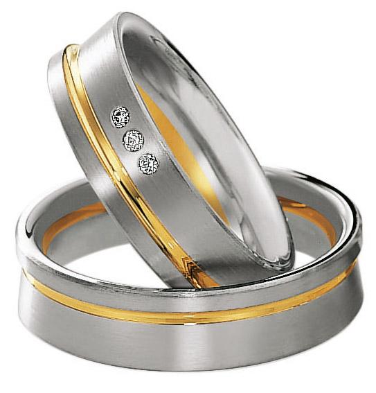 Manufaktur Saint Maurice - Deutschland. Kollektion Eternity. Die Pforzheimer Manufaktur stellt nicht nur wunderschönen Schmuck sondern auch perfekt aussehende Trauringe. 585 Weiss / Gelbgold seidenmatt und poliert. 3 Brillanten 0,045 ct. W/SI. Breite 6,00 mm.