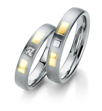 Manufaktur Saint Maurice - Deutschland. Kollektion TWIN SET. Die Pforzheimer Manufaktur stellt nicht nur wunderschönen Schmuck sondern auch perfekt aussehende Trauringe. 585 Weissgold seidenmatt und poliert / Gelbgold poliert. 1 Brillant 0,06 ct. W/SI. Breite 4,50 mm.