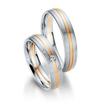 Manufaktur Saint Maurice - Deutschland. Kollektion TWIN SET. Die Pforzheimer Manufaktur stellt nicht nur wunderschönen Schmuck sondern auch perfekt aussehende Trauringe. 585 Weissgold / Gelbgold strichmatt. 3 Brillanten zusammen 0,06 ct. W/SI. Breite 5,00 mm.