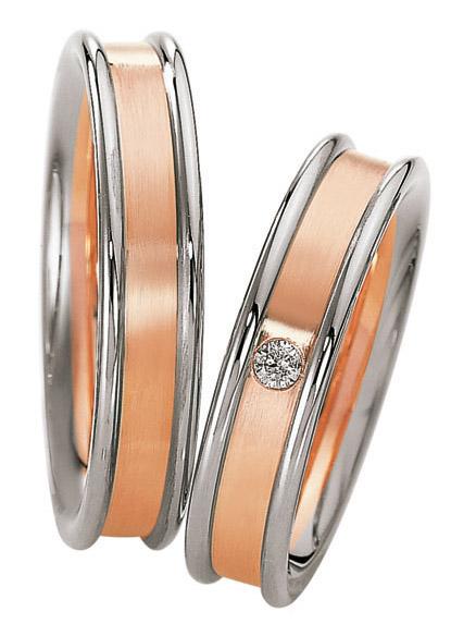 Manufaktur Saint Maurice - Deutschland. Kollektion Eternity. Die Pforzheimer Manufaktur stellt nicht nur wunderschönen Schmuck sondern auch perfekt aussehende Trauringe. 585 Weiss / Rotgold seidenmatt und poliert. 1 Brillant 0,045 ct. W/SI. Breite 5,00 mm.