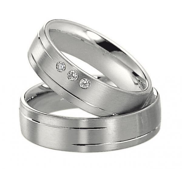 Manufaktur Saint Maurice - Deutschland. Kollektion - Eternity. Die Pforzheimer Manufaktur stellt nicht nur wunderschönen Schmuck sondern auch perfekt aussehende Trauringe. Trauringe in 585 Weissgold seidenmatt mit Fugen. 3 Brillanten zusammen 0,06 ct. W/SI. Breite 6,00 mm.
