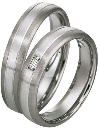 Manufaktur Saint Maurice - Deutschland. Le style. Die Pforzheimer Manufaktur stellt nicht nur wunderschönen Schmuck sondern auch perfekt aussehende Trauringe. 585 Weissgold / Graugold seidenmatt mit Fuge. 1 Diamant - Baguette 0,06 ct. TW/IF. Breite 5,00 mm.