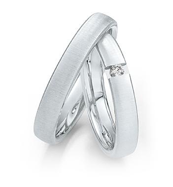Manufaktur Saint Maurice - Deutschland. Kollektion TWIN SET. Die Pforzheimer Manufaktur stellt nicht nur wunderschönen Schmuck sondern auch perfekt aussehende Trauringe. Trauringe in 585 Weissgold sandmatt. 1 Brillant 0,05 ct. W/SI. Breite 4,00 mm.