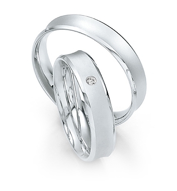Manufaktur Saint Maurice - Deutschland. Kollektion TWIN SET. Die Pforzheimer Manufaktur stellt nicht nur wunderschönen Schmuck sondern auch perfekt aussehende Trauringe. Trauringe in 333 Weissgold poliert und seidenmatt. 1 Brillant 0,02 ct. W/SI. Breite 5,00 mm.