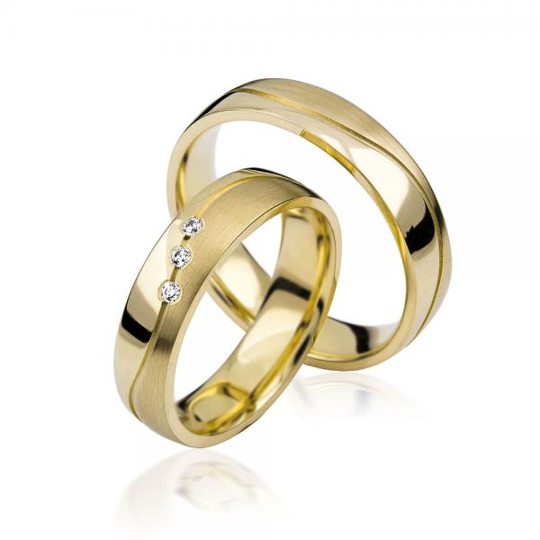 Neue Kollektion 2016 von Simon & Söhne - Gütersloh. Trauringe in 375er Gold, gerne auch in 585er und 750er Gold zu haben. Sowohl mit Zirkonia als auch mit Brillantbesatz. Hier abgebildet mit 3 Zirkonia 0,06ct ( Zuschlag mit Brillant tw-si 150EUR ) Breite 5,00mm.
