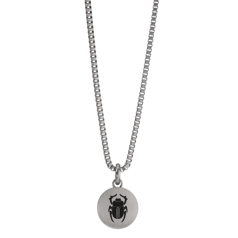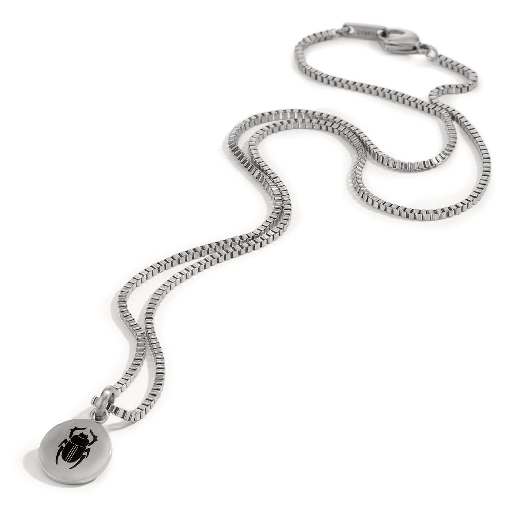 Die TeNo-Signature-Halskette symbolisiert als stylisher Talisman das Leben selbst. Das energetische Schutzsymbol Skarabäus steht für Auferstehung, Schöpferkraft und Fruchtbarkeit. Die handgefertigte und massive Kette unterstreicht auf subtile Weise Individualität durch die tief eingravierte und mit Emaille veredelter Symbolik des Skarabäus. Wer die Kette verschenken möchte, kann auf der Rückseite des Anhängers noch einen Namen oder Datum eingravieren lassen.
