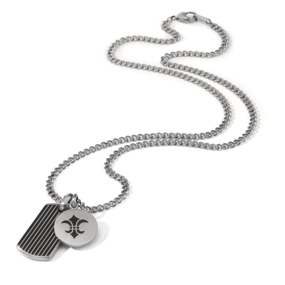 Unkonventionell, lässig und maskulin: Die handgefertigte TeNo-Signature-Kette mit zwei baumelnden Anhängern aus Edelstahl vereint spielerisch ein grafisches Streifenmuster mit der symbolischen Bedeutung der Schwertlilie. Sowohl das grafische Muster wie auch das Fleur-de-Lys Symbol sind tief eingraviert und anschliessend mit schwarzer Emaille veredelt. Wer die Kette verschenken möchte, kann auf der Rückseite des Tag-Anhängers noch eine persönliche Botschaft eingravieren lassen.
