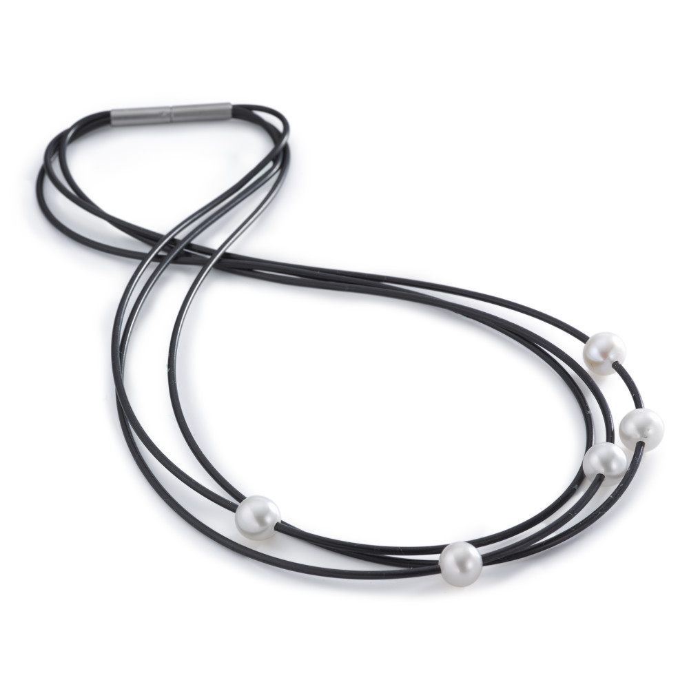 Dreireihiges Perl Collier aus Kautschuk mit 5 weißen Zuchtperlen