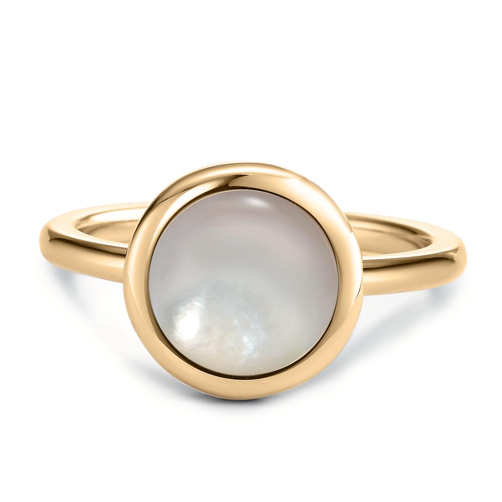 Klassisch und zeitgleich modern: Der Elyna Edelstahlring in Gold mit strahlendem Perlmutt-Cabochon besticht durch eine zeitlose Formensprache. Im selben Design erhältlich sind Ohrstecker, Ohrhänger und Schmuckanhänger, die ganz nach Geschmack, Stimmung und Anlass kombiniert werden können.