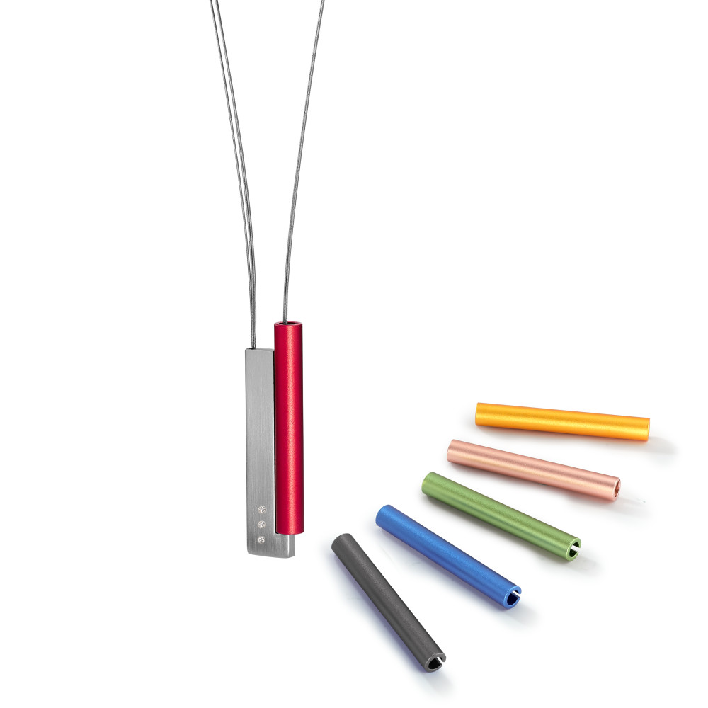 TeNo Schmuckset TUBE rechteck, V-Collier. Satinierter Edelstahl, 3 x 0,008 ct. TW/si mit 6 austauschbaren Farbröhren aus Aluminium
