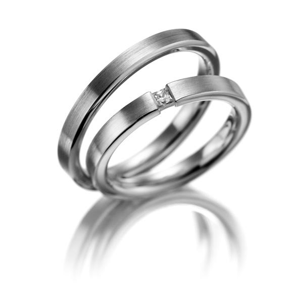 NEUER HERSTELLER: Weidner Trauringe aus Waldstetten. Klassische, schlichte Ringe aus Weißgold 375. 1 Brillant in princess-cut 0,05 ct tw-if.