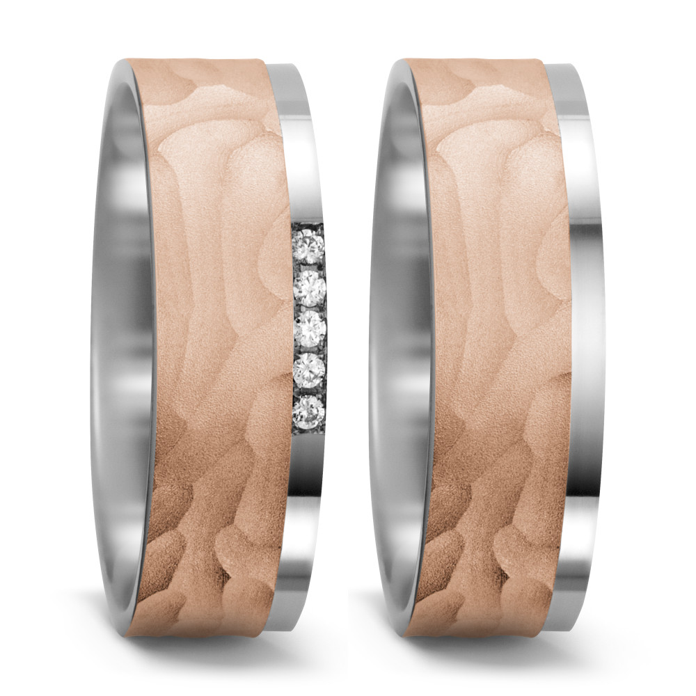 NEUER HERSTELLER: Weidner Trauringe aus Waldstetten. Zweifarbige, Ringe mit einer aussergewöhnliche Oberfläche aus Grau - Rosegold 585. 5 Brillanten 0,05 ct tw-si.