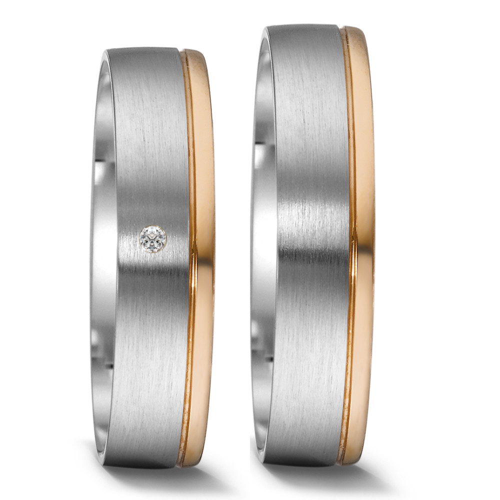 NEUER HERSTELLER: Weidner Trauringe aus Waldstetten. Zweifarbige, schlichte Ringe aus Grau - Rotgold 375. 1 Brillant 0,01 ct tw-si.