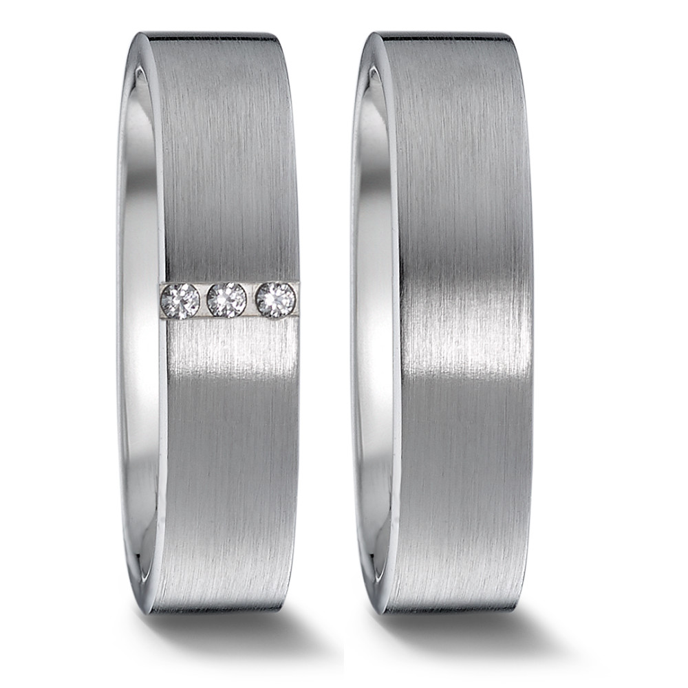 NEUER HERSTELLER: Weidner Trauringe aus Waldstetten. Eckige, schlichte Ringe aus Weißgold 375. 3 Brillanten 0,045 ct tw-si.