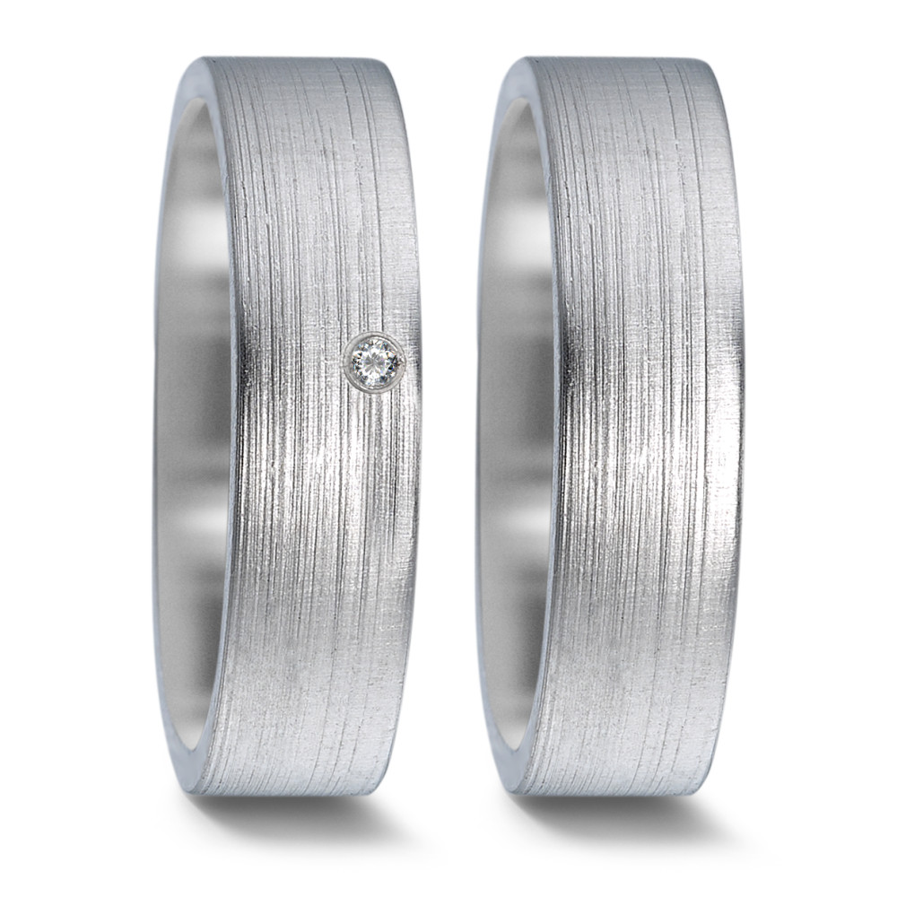 NEUER HERSTELLER: Weidner Trauringe aus Waldstetten. Schöne Ringe mit einer untypischen Oberfläche aus Weißgold 375. 1 Brillant in 0,02 ct tw-si.