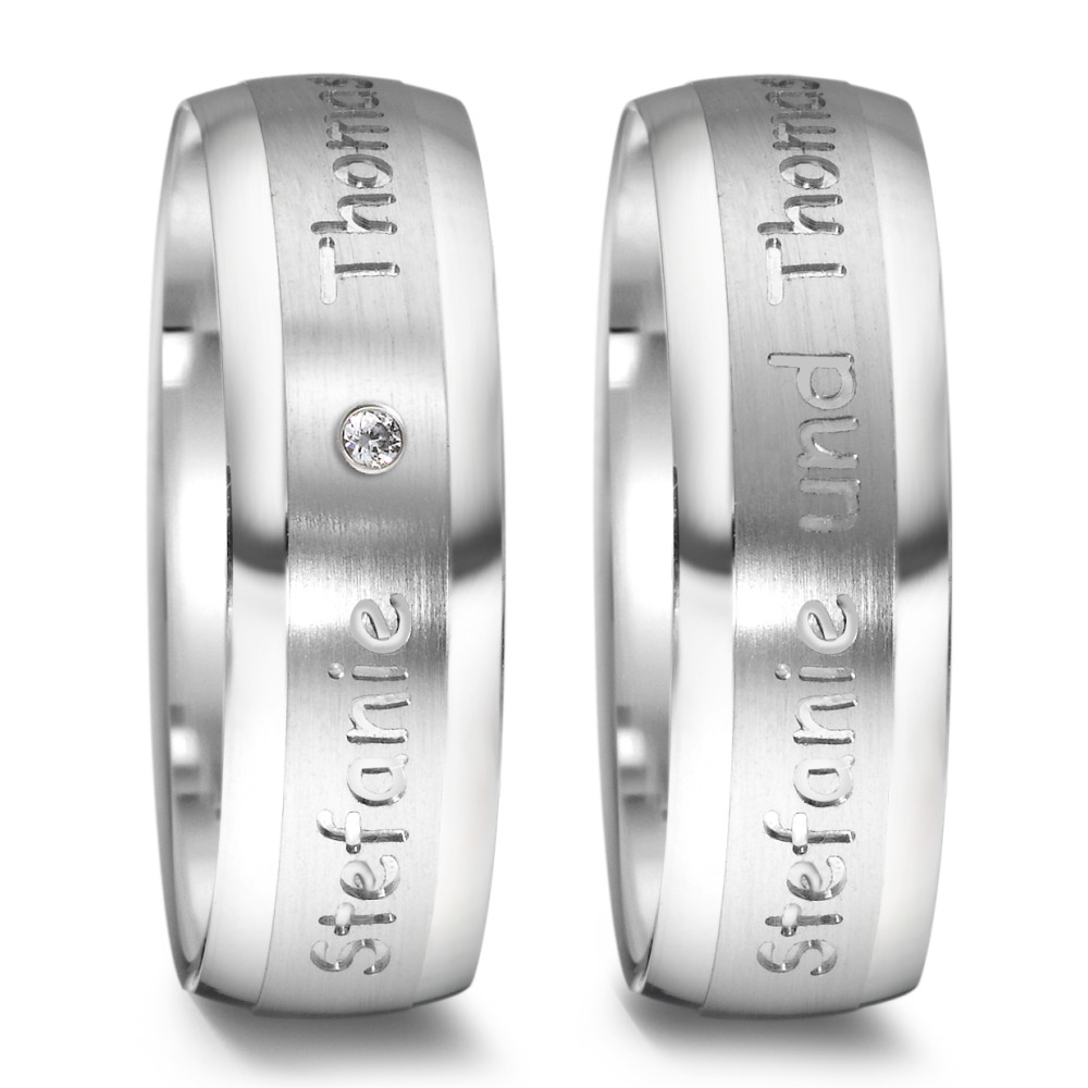 Trauringe aus Weißgold 375 aus der Manufaktur Weidner. Persönliche Gravur aussen und auch innen machbar. 1 Brillant 0,015ct tw-si. Breite 7,0 mm. Höhe 1,8 mm.